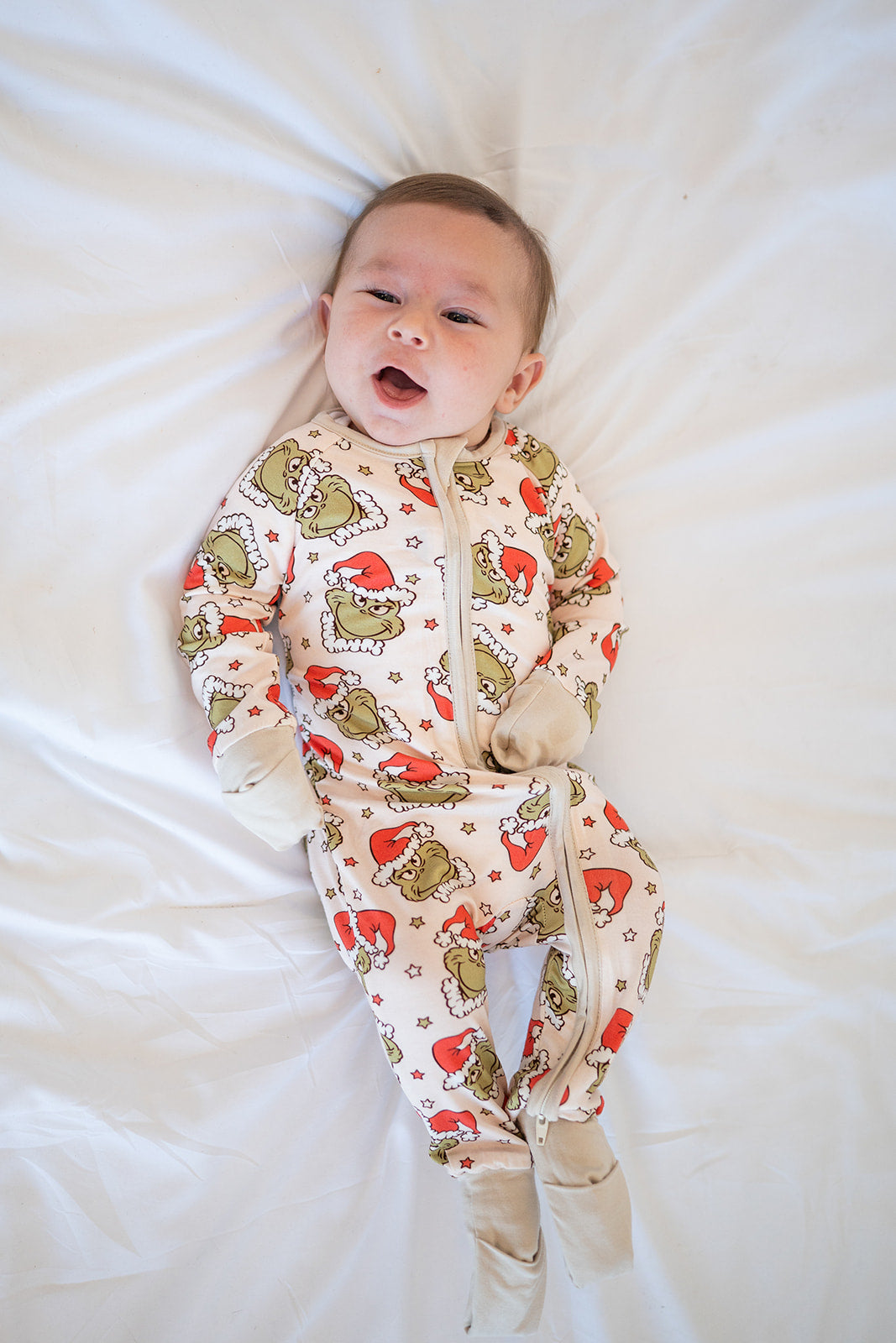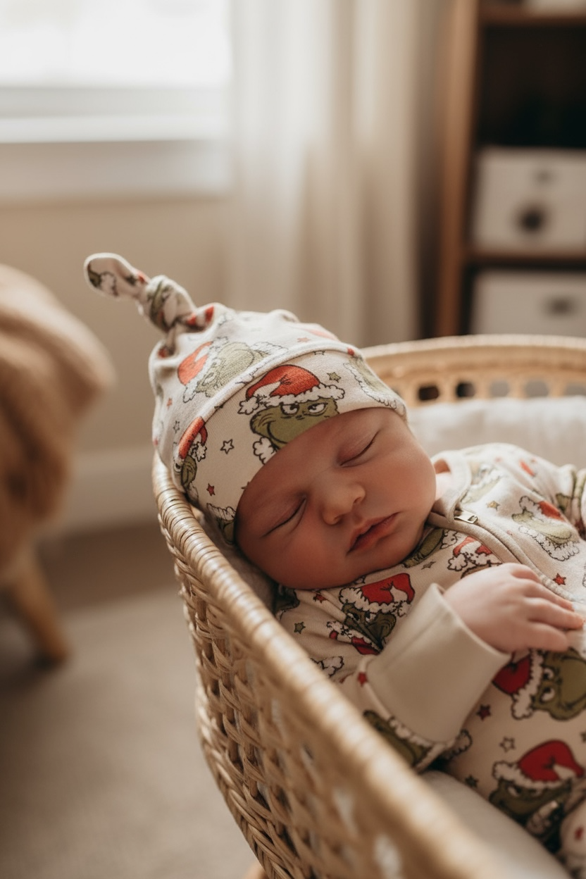 Bring a little holiday mischief to bedtime! This Grinch-inspired print features everyone’s favorite green grouch dressed in a Santa hat, sprinkled across a creamy backdrop with twinkling stars. Perfect for little ones who love the magic of Christmas with a touch of playful grin, this print is sure to be a holiday favorite.