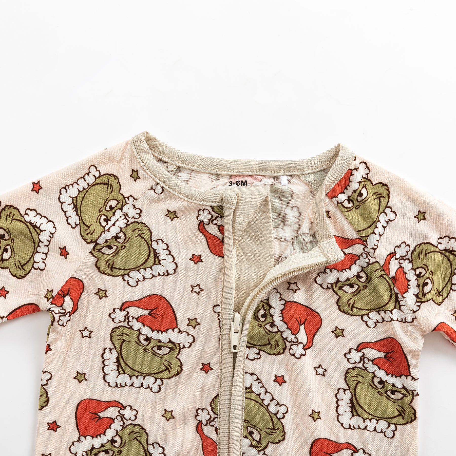 Bring a little holiday mischief to bedtime! This Grinch-inspired print features everyone’s favorite green grouch dressed in a Santa hat, sprinkled across a creamy backdrop with twinkling stars. Perfect for little ones who love the magic of Christmas with a touch of playful grin, this print is sure to be a holiday favorite.