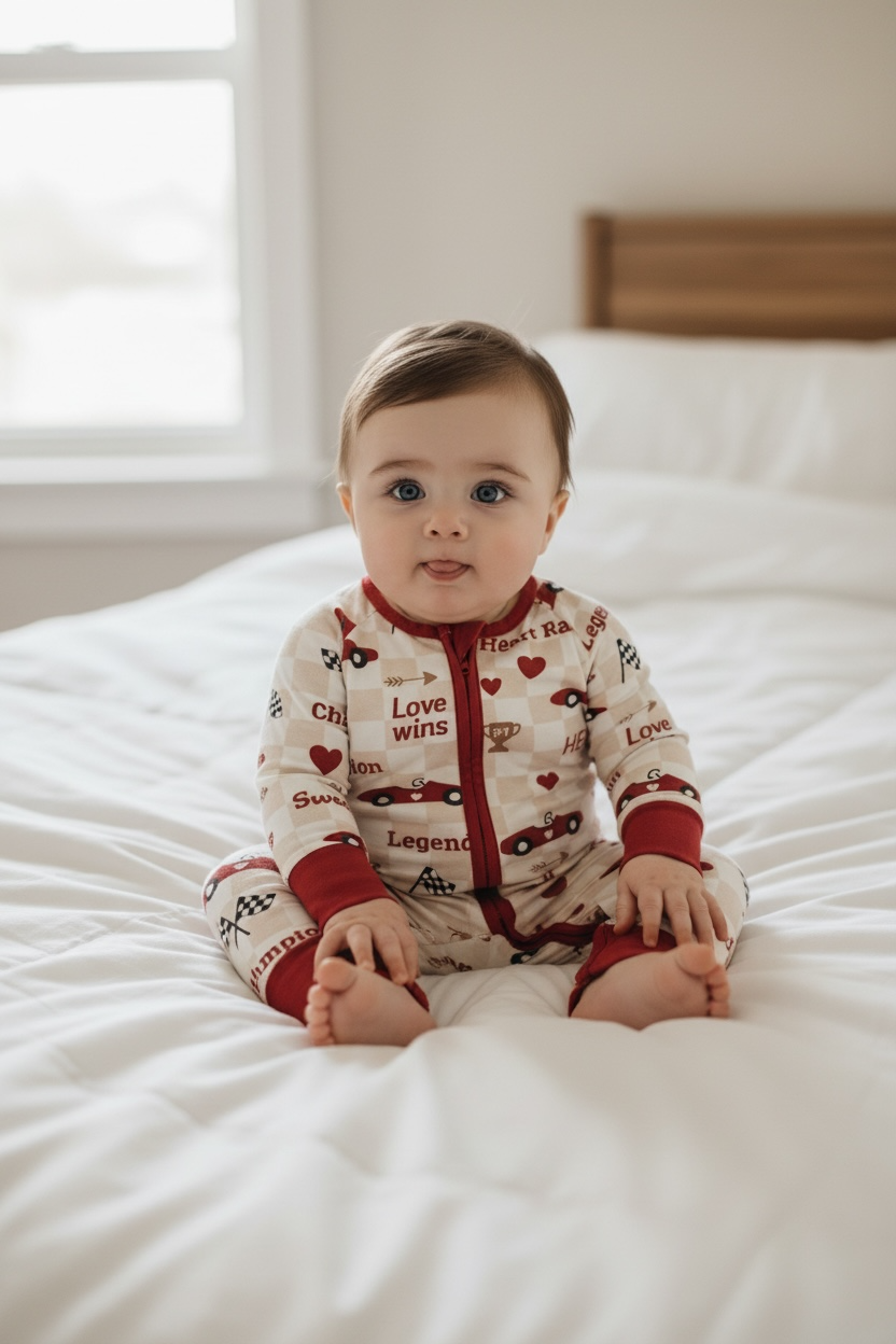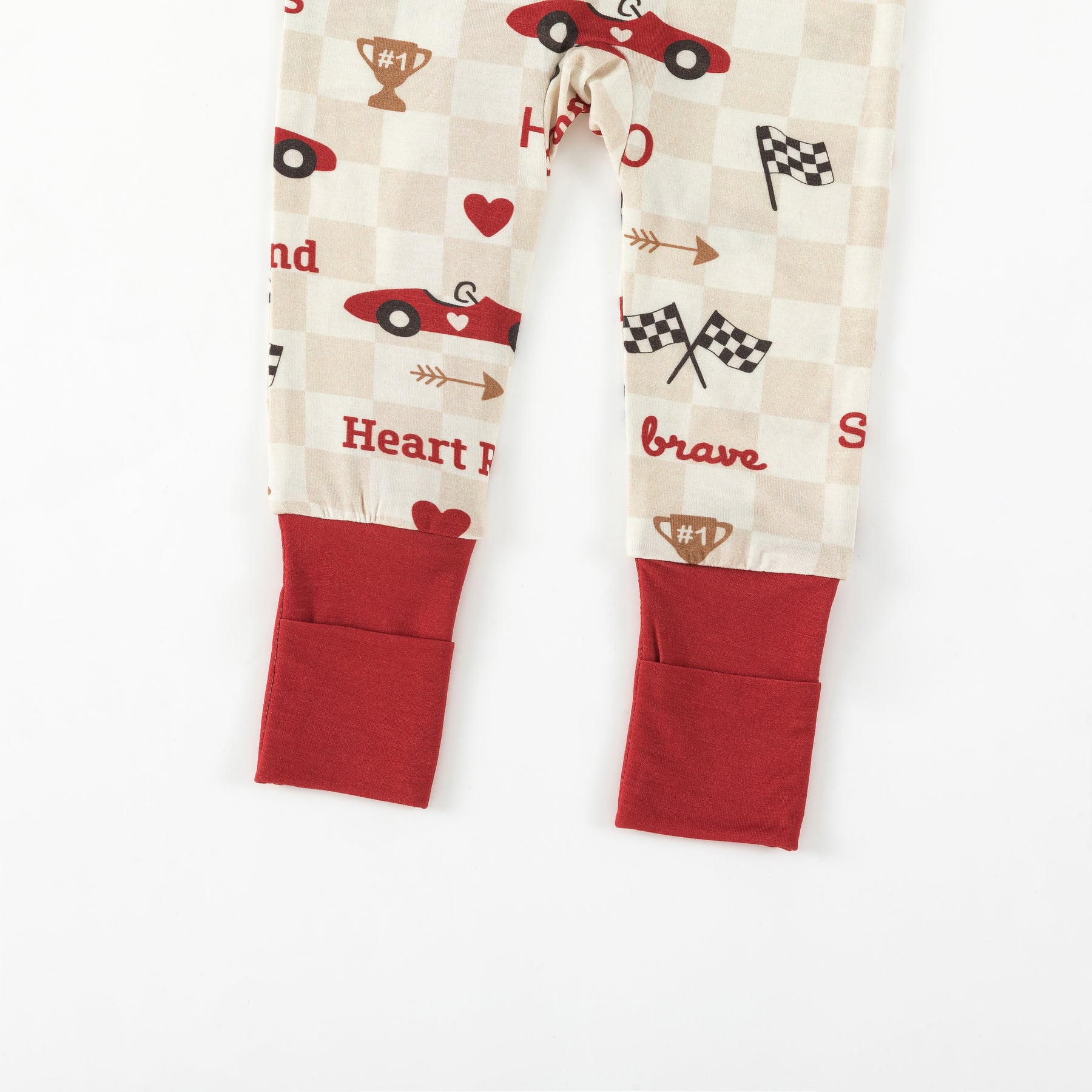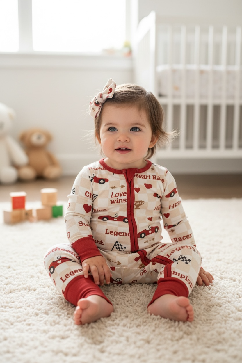 Your little champion will speed straight into Valentine’s Day in our Heart Racer convertible footie. This playful print features vintage-style race cars, tiny checkered flags, and sweet love-themed phrases like “Love Wins,” “Sweetheart,” and “Legend.” A soft cream checkered background gives the whole design a classic retro-racing vibe with a Valentine twist.